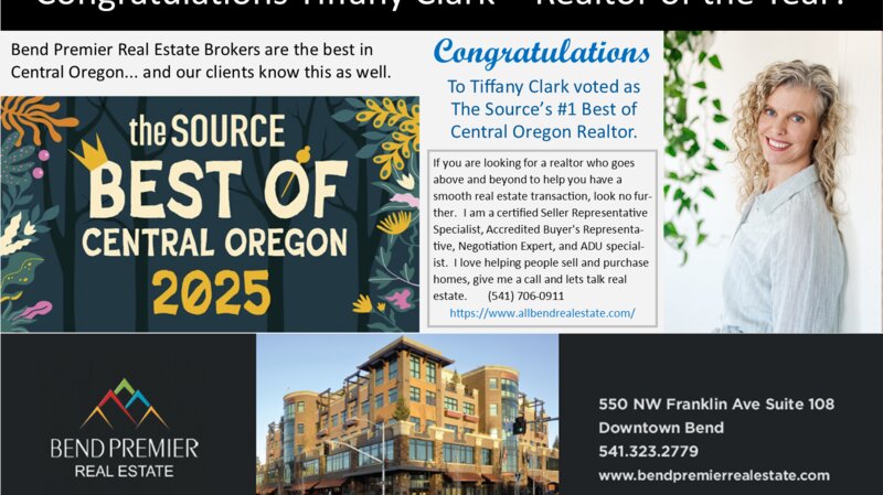 Congratulations to Tiffany Clark, Bend Premier Principal Broker, for being named the Source Weekly's Best Realtor in Central Oregon for 2025. Our Brokers are the best and Central Oregon knows it as well!